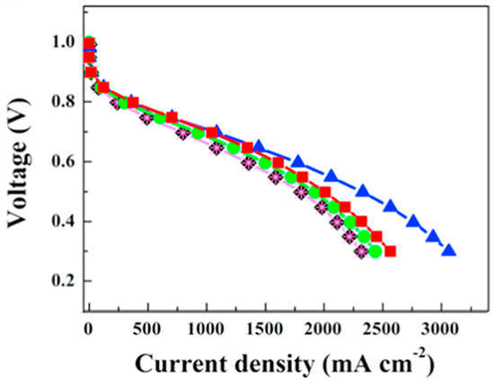 However, DMFCs suffer from low performance due to methanol crossover. Methanol crossover happens when methanol molecules diffuse through the membrane and are directly oxidized by oxygen on the cathode, causing a mixed potential so, consequently, a decrease in cell performance [19]. Although methanol has a high energy density (about 1.8 kWh kg−1 or 1.7 kWh L−1), it must be diluted in order to reduce methanol crossover. A consequence of dilution is that the cell stack dimensions must be proportionally increased, making it challenging to utilize on small and portable devices.
