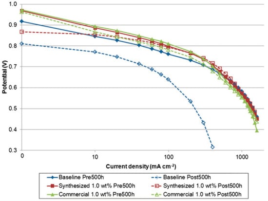 Polyaniline is a good conductive polymer that can improve both methanol oxidation and the stability of the catalyst; it can also be included in the Nafion structure through both electrochemical and chemical modification to improve its properties. Wang et al. [65] and Escudero-Cid et al. [66] assembled a composite membrane of Nafion/polyanilina and carried out DMFC performance tests including polarization curve and durability tests showing that both the ionic conductivity and methanol permeability of the Nafion membrane containing PANI decreased when compared with Nafion membrane. In particular, Wang et al. indicated that the performance of the fuel cell increased using the modified membrane especially at high methanol concentration (maximum power output at 6 M) while the power output using Nafion pristine membrane was reduced with increasing methanol concentration. Moreover, it was noted that the PANI composite membrane performed better than that with polypyrrole [67]. It is important to highlight here that the reviewed papers; investigating the use of conductive polymers, do not consider the change in the electronic conductivity of the membrane (short circuit current) in the composite membrane. This should be considered in any future work on these materials.