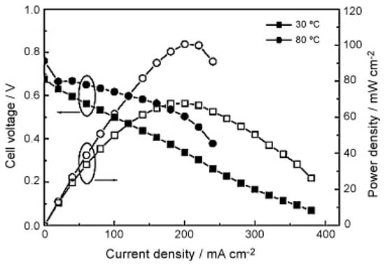 - in 1 M methanol solution, the current density and power density for the composite membrane at 0.4 V were 102.7 mA cm−2 and 42.9 mW cm−2, whereas the commercial Nafion 115 revealed only 78.6 mA cm−2 and 32.6 mW cm−2.