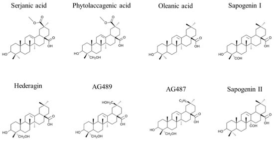 - Kuljanabhagavad, T.; Thongphasuk, P.; Chamulitrat, W.; Wink, M. Triterpene saponins from Chenopodium quinoa Wild. Phytochemistry 2008, 69, 1919–1926. [Google Scholar] [CrossRef]