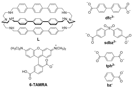 Structures of the azacryptand L, the fluorescent indicator (6-TAMRA) and the carboxylates investigated in this work.