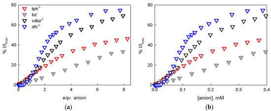 Competition experiments were also performed with tph2− and bz− (Figures S6 and S7); however, a lower recovery of the indicator emission was obtained (see Figure 5 and Table 1; more details are available in SI). This result is attributable to the lower geometrical complementary between the anion bite and the receptor’s cavity, as well as weaker hydrophobic and π–π* interactions between these anionic guests and the cavity [29]. From the fluorimetric titration profiles, we could determine the binding constants only for dfc2− and sdbz2−.