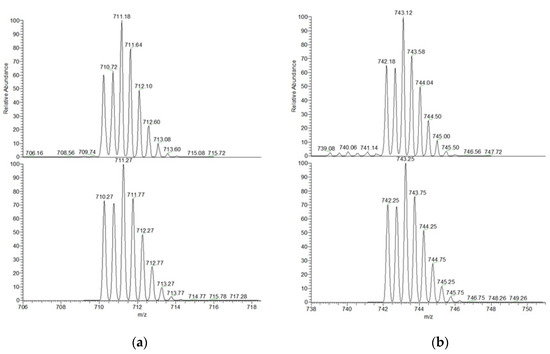 Top: zoom scans of the peaks at 711 m/z and 743 m/z, obtained from the experimental mass spectrum of an equimolar solution of [Cu2L]4+ and either dfc2− (a) or sdbz2− (b) in CH3CN:H2O 4:1. Bottom: simulated peaks, calculated for the double charged adduct [Cu2C86H86N8O4]2+ (a) and [Cu2C86H86N8O6S]2+ (b).