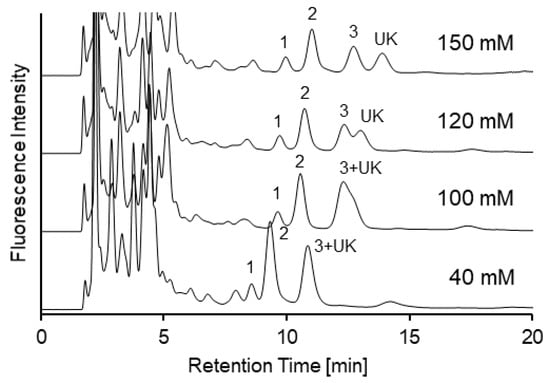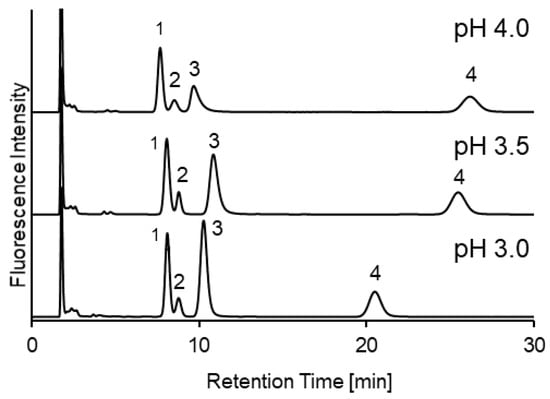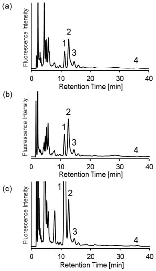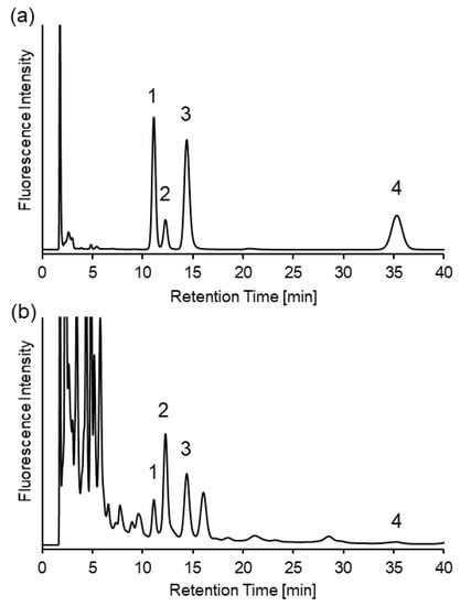 - Yamamoto, S.; Hayashi, Y.; Matsunaga, H.; Okada, F.; Kinoshita, M.; Suzuki, S. Analysis of 2-Aminobenzoic Acid-Labeled Monosaccharides and Glycoprotein-Derived Oligosaccharides by Online Cleanup Liquid Chromatography in the Reversed-Phase and Hydrophilic Interaction Liquid Chromatography Modes. Chromatography 2019, 40, 65–70. [Google Scholar] [CrossRef]