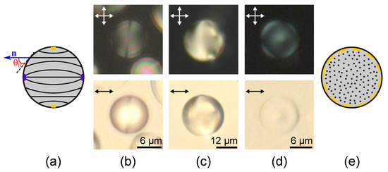 - Krakhalev, M.N.; Prishchepa, O.O.; Sutormin, V.S.; Zyryanov, V.Y. Director configurations in nematic droplets with tilted surface anchoring. Liq. Cryst. 2017, 44, 355–363. [Google Scholar] [CrossRef]