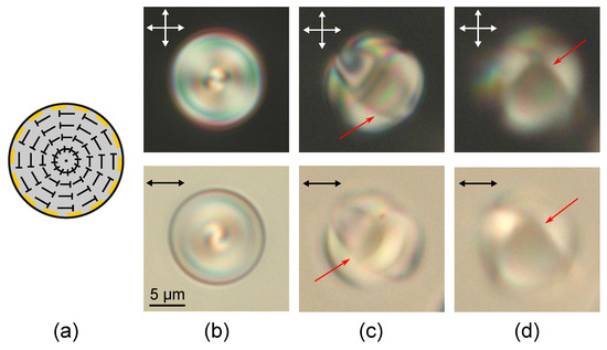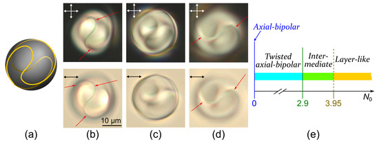 The axisymmetric twisted axial-bipolar configuration is formed in the cholesteric droplets at under conical surface anchoring (Figure 2 and Figure 3). The director twist angle on the droplet diameter in the equator plane (the plane of the circular defect) depends on and can be measured by the method of rotating polariser and analyser [49]. For instance, the twist angle is 130 for droplets with , 160 at , and 180 at . Like in nematic droplets, the symmetry axis of the twisted axial-bipolar droplets is oriented differently relative to the sample plane (Figure 2 and Figure 3). Figure 3b shows the droplet in which the circular defect is situated in the film plane and Figure 3c,d demonstrate the droplet with the symmetry axis tilted to the film plane by an angle approximately 50. In the last case, the circular surface defect and two boojums located above and below the central cross-section of droplet can be clearly observed by changing a position of the microscope focus [47].