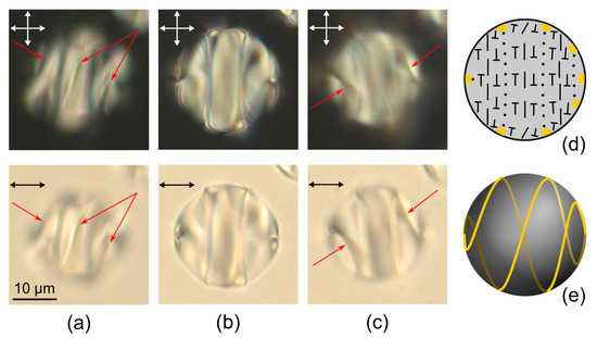 A formation of the layer-like structure leads to either a local disturbance of the boundary conditions, as in the case of weak surface anchoring [45] or an appearance of the linear surface defect as in the case of strong homeotropic anchoring [38]. The double twisted defect loop is formed near the droplets surface under study (Figure 4 and Figure 5). The linear surface defect transverse the central droplet section at the points located at the isoclinic lines, therefore the director is parallel to the interface near the linear defect. If the cholesteric axis is oriented mainly perpendicular to the film plane, the cholesteric layers are practically invisible (Figure 5c). When changing the microscope focus, the double twisted defect loop can be seen (Figure 5).