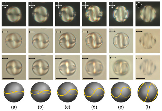 The twisted axial-bipolar structure () has the symmetry axis, and the layer-like configuration () has the symmetry axis. A transition from one configuration to another one proceeds smoothly as increases (Figure 5e). The intermediate structures with the defect line deformed around the droplet’s equator are observed at . At that, the deformation degree of this line increases as rises up to 3.95 (Figure 6). The observed structures and corresponding ranges are stable. In this case, the position of the intervals’ boundaries (Figure 5e) should be dependent on the anchoring energy value and/or the intrinsic helix pitch . For instance, in the work of Yoshioka et al. [45], the transition between an axisymmetric double twisted structure () and a layer-like structure occurs at without the formation of intermediate structures.