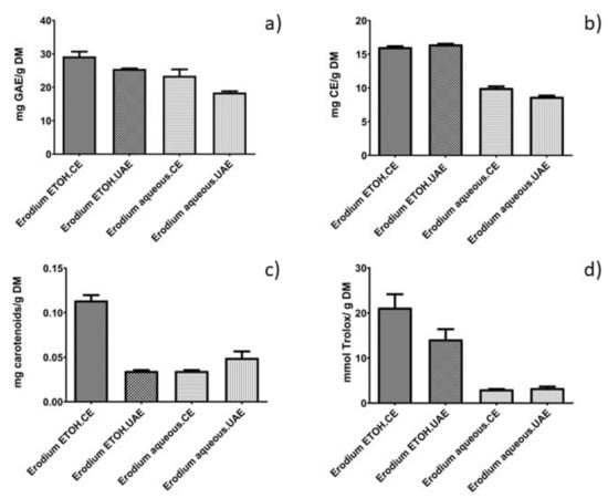 Barba, F.J.; Alcántara, C.; Abdelkebir, R.; Bäuerl, C.; Pérez-Martínez, G.; Lorenzo, J.M.; Carmen Collado, M.; García-Pérez, J.V. Ultrasonically-Assisted and Conventional Extraction from Erodium Glaucophyllum Roots Using Ethanol:Water Mixtures: Phenolic Characterization, Antioxidant, and Anti-Inflammatory Activities. Molecules 2020, 25, 1759. https://doi.org/10.3390/molecules25071759