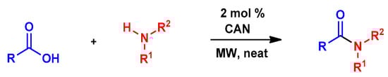 In this paper, we report a microwave-assisted synthetic protocol for the preparation of amides directly from carboxylic acids and amines in very good to excellent yields at reaction times significantly shorter (one to few hours) than those of many previously reported direct amidations. Our protocol also eliminates the need for a solvent or any additional reagents, a significant advantage over previously reported methods. In addition, the reaction occurs in the presence of trace amounts (0.1–2 mol%) of ceric ammonium nitrate (CAN), a common catalyst for microwave reactions [29,30], or even without a catalyst at all (for some substrates) (Scheme 1). Pure products were isolated through extraction with ethyl acetate/water mixtures (acidic, basic, or saline) without the need for tedious column chromatography. Additionally, this process separated any traces of the catalyst, enabling the recovery of cerium, and minimizing any potential environmental threat and increasing the economics of the process. As such, this methodology is a major leap forward in the endeavor of developing an ideal green synthesis of amide bonds.