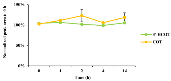 Effect of digestion time in 1 M NaOH on stabilities of COT and 3-HCOT (n = 3). Peak areas were normalized with respect to the corresponding peak areas obtained at 0 h.