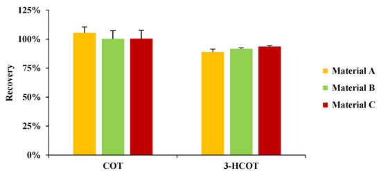 Finally, the QuEChERS technique (including dispersive solid-phase extraction, SPE) was tested for the extraction of COT and 3-HCOT using different materials: material A (magnesium sulfate (800 mg), sodium acetate (200 mg) and primary secondary amine (PSA, 150 mg)) [23]; material B (magnesium sulfate (800 mg), sodium chloride (200 mg) and C18 powder (150 mg)); and material C (magnesium sulfate (800 mg), sodium chloride (200 mg) and PSA (150 mg)). As illustrated in Figure 2, all materials exhibit good extraction efficiencies. However, traces of COT are detected in the sodium acetate in material A and the C18 powder in material B. Thus, material C was chosen for the QuEChERS sample preparation.