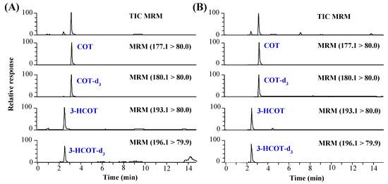 Direct or indirect smoking is closely related to various diseases, such as cancer and respiratory and cardiovascular diseases. Nicotine is a natural alkaloid contained in the tobacco plant, and a major substance linked to cigarette addiction. Nicotine absorbed into the human body through cigarette smoking can be converted into multiple metabolites [1]. Approximately 70–80% of the absorbed nicotine is transformed to cotinine (COT) by the CYP450 system (mainly CYP2A6). This primary metabolite is further converted into trans-3′-hydroxycotinine (3-HCOT) [2], and both COT and 3-HCOT are major metabolites of nicotine. The half-life of nicotine is relatively short, at approximately 3–4 h. In contrast, COT and 3-HCOT have relatively long half-lives of approximately 7–40 h and 4–8 h, respectively, making them suitable alternative indicators of cigarette smoking.