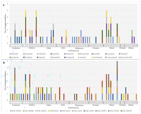 (a) Distribution of the pGI50 upper outlier values obtained for the NCI-60 cancer cell lines for the 18 PKIs from the predictive set. (b) Distribution of the pGI50 upper outlier values obtained for the NCI-60 cancer cell lines for the top 10 best-scoring compounds illustrated in Table 5. Cell line numbers correspond to cell line names as initially presented in Table 2 and are separated by tissue types for easier interpretation. The graph shows colored bars corresponding to a certain compound wherever the pGI50 value was identified as being an upper outlier for that compound. By comparison, some similarities between profiles of some of the PKIs from the predictive set and the top 10 predicted potential PKIs can be observed.
