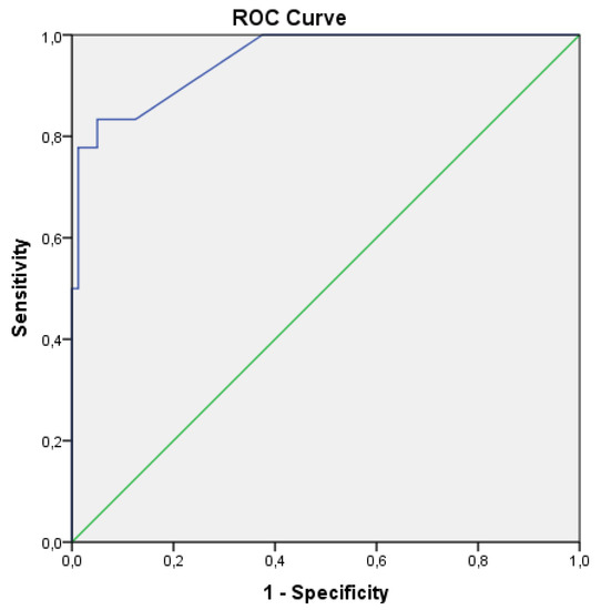 Internal validation of the score results was performed in the form of a ROC (receiver operating characteristic) curve analysis, assessing the accuracy of the scoring system on the predictive set. The ROC curve graph is presented in Figure 3. Descriptives for the scores of the predictive set compounds can be found in the Supplementary Material section, Table S3. Based on this analysis, the cut-off value for the score was set to be 10.21, with an area under the curve of 0.952, sensitivity of 0.833 and 1–specificity value of 0.50.