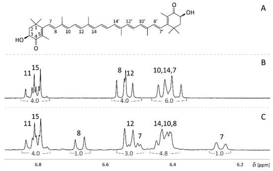 The structure of astaxanthin (A) and 1H NMR spectra of the astaxanthin standards in acetone at 300 K (600 MHz). (B) Natural astaxanthin (Ax); (C) 7,7′, 8,8′-13C-enriched astaxanthin (13C-Ax). The numbers over the spectra show the resonance assignment (symmetrical hydrogens are shown with the same number). The numbers in buckets below the spectra show the relative integral values. δ – chemical shift in parts per million (ppm).