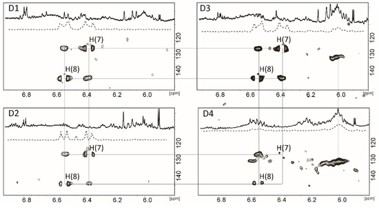 The substitution of 12C(7) and 12C(8) carbons by 13C allows the detection of the 1H-13C coupling. This phenomenon is observed in the 1H spectrum of 13C-Ax as two satellite signals on the sides of the main uncoupled signal that is not seen anymore. Theoretically, the one bond 1H-13C coupling constants for the compounds with a sp2-hybridization could be expected between 115 and 250 Hz [15,16]. The 2D 1H-13C HSQC and HMBC spectra help to determine the coupling constant. Figure 2 shows that the 1H-13C HSQC spectrum of 13C-Ax contains a cross peak at 6.55/142 and 6.39/124 ppm (Figure 2, black line). The used pulse program (hsqcetgpprsisp2.2) reveals that the chemical shift of H(7) and H(8) in 13C-Ax is similar to that of the natural compound. On the other hand, the spectrum of the 1H-13C HMBC experiment (hmbcgplpndprqf pulse program, Figure 2, gray line) contains two pairs of satellite cross peaks on both sides from the HSQC cross peaks (6.26/124 and 6.52/124; 6.68/142 and 6.43/142 ppm, Figure 2). These HMBC cross peaks have the same chemical shift as the resonances in the lower 1D 1H spectrum of 13C-Ax (Figure 2). Because the satellite resonances of H(7) and H(8) are located at a distance of 150 Hz, it can be concluded that the coupling constants 1J(C7,H7) = 1J(C8,H8) are 150 Hz. This value is in agreement with the theoretical value reported above. Despite the satellite signals usually maintaining the coupling pattern of the main peak, the presence of other 13C and 12C neighboring atoms breaks the symmetry of the multiplet structure of the H(7) satellites at 6.51 ppm (Figure 2, lower 1D 1H NMR spectrum). The hsqcetgpprsisp2.2 pulse program removes the satellite cross peaks. Therefore, the 1H-13C HSQC spectra of the hepatocytes extracts and natural carotenoids standards could be compared in order to assign the 13C-Ax derivatives.