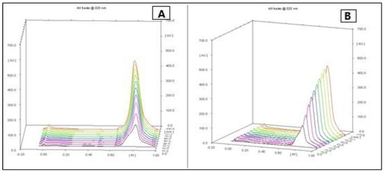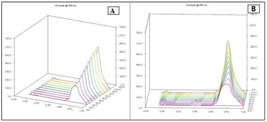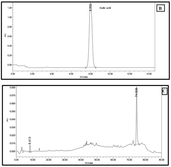 High-performance thin-layer chromatography is an improved form of the normal thin-layer chromatography. Several augmentations can be made to the basic method of thin-layer chromatography to automate the different steps, increase the resolution achieved and allow more accurate quantitative measurements. In this method 10 tracks were applied on the TLC plate with silica gel 60 (for 10 × 10 cm) using micro syringe. The plates were saturated for 20 min in a twin trough glass chamber with the mobile phase of methanol (100%). The plates were placed in the mobile phase and dried. A densitometric scanning of plates were performed at 254 nm and 320 nm using a Camag TLC scanner III operated in reflectance–absorbance mode. To examine the chemical profiling of F13b1/PV-EA, analysis was carried out using a C18 column on a Breeze2 system. First, 20 μL of blended standard (gallic acid, cyaniding and flavonoid quercetin) was injected to the column with water and acetonitrile solvent. Subsequently, 20 μL of standard of gallic acid and finally 20 μL of compound or F13b1/PV-EA was injected to the column. For comparing the three injections’ properties and identification of the chemical profile of our compound, after each injection, the retention time (RT) or the amount of time that a compound spends on the column from injection to detection, was calculated.