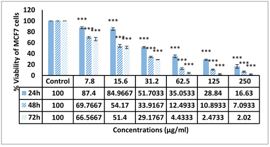 The MCF-7 human breast adenocarcinoma cell line was procured via the American Type Culture Collection (ATCC, Manassas, VA, USA). Roswell Park Memorial Institute medium (RPMI-1640) supplemented with 10% fetal bovine serum and 1% penicillin and streptomycin (Sigma-Aldrich, St. Louis, MO, USA) was used for the cultivation of MCF-7 and this were subsequently cultured in a humidified incubator using 5% CO2 at 37 °C.
