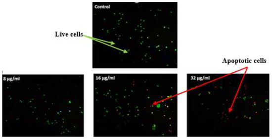 After a 24-h incubation of the 1 × 106 cells/well of MCF-7 cells in a 6-well plate, the cells were treated with 8, 16 and 32 µg/mL of F13b1/PV-EA for 48 h. Then detached cells were dyed with AO/PI stain according to manufacturer’s protocol and examined using fluorescence microscope.
