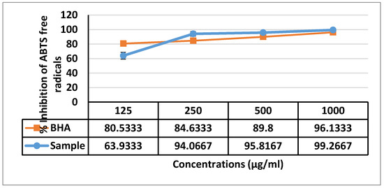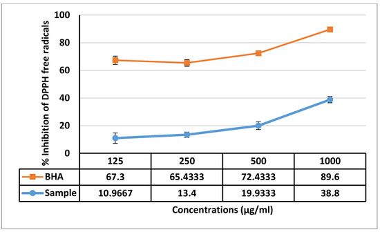 Percentage of inhibition of DPPH free radical = Absorbance of control − Absorbance of sample/Absorbance of control × 100