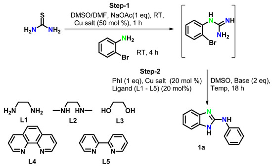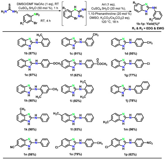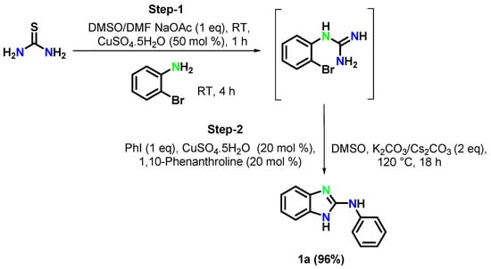- Kondraganti, L.; Manabolu, S.b.; Dittakavi, R. Synthesis of Benzimidazoles via Domino Intra and Intermolecular C-N Cross-Coupling Reaction. Chem. Sel. 2018, 3, 11744–11748. [Google Scholar] [CrossRef]
