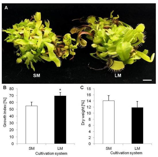 Dionaea muscipula plants in different cultivation systems: (A) plants cultivated on solid medium (SM) and in liquid medium with rotary shaking (LM); (B) growth index [%] of plants depending on cultivation system; (C) dry weight content [%] of plants depending on cultivation system; * significant difference between means at p < 0.05; bar—1 cm.