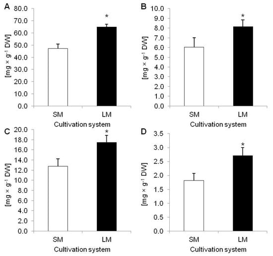 Accumulation of phenolic compounds in Dionaea muscipula plants cultivated on solid medium (SM) and in liquid medium with rotary shaking (LM); (A) total phenolic content; (B) phenylpropanoids; (C) flavonoids; and (D) anthocyanins depending on cultivation system; * significant difference between means at p < 0.05; bar—standard deviation.