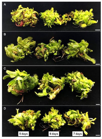 Morphology of Dionaea muscipula plants after 5, 6 and 7 days of elicitation with Cronobacter sakazakii lysate in different concentrations: (A) control (0%); (B) 1.5%; (C) 2.5%; (D) 5%; bar—1 cm.