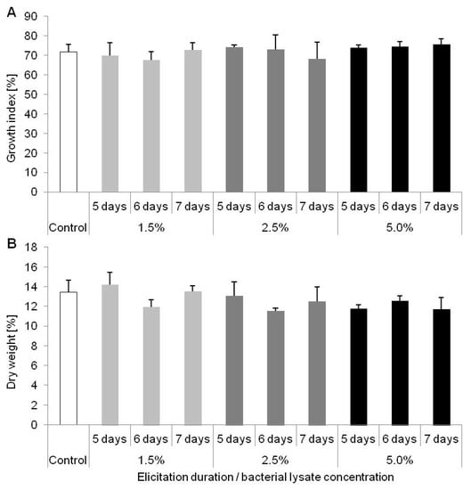 The elicitor in this experiment was lysate from human-pathogenic bacteria Cronobacter sakazakii ZOBR A741, and selected based on our preliminary data and available literature [39]. The elicitor was prepared according to Jesionek et al. [20]. Briefly, microbes were cultivated 24 h in Luria broth (LB) medium at 37 °C. Suspension cultures (15 × 1012 colony-forming units (CFU)/mL, according to McFarland scale) were treated with toluene (100:1 v/v), toluene was evaporated, and the elicitor was autoclaved. This prepared lysate was used for plant elicitation.