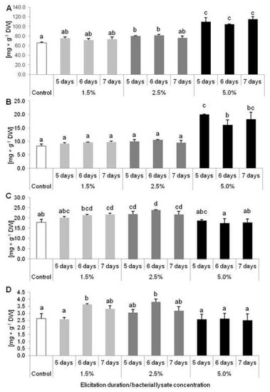 Accumulation of phenolic compounds in Dionaea muscipula plants after 5, 6 and 7 days of elicitation with Cronobacter sakazakii lysate in different concentrations: (A) total phenolic content; (B) phenylpropanoids; (C) flavonoids; (D) anthocyanins; different letters—significant difference between means at p < 0.05, bar—standard deviation.