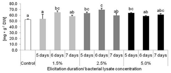 Applied elicitation also changed the accumulation of some phenolic derivatives in examined plants. Increased PLU content was noted after 5 days of treatment with 2.5% and 5% elicitor and after 6 days with 1.5% and 2.5% of the elicitor (Figure 6). The most effective results were noticed in plants treated with 2.5% elicitor for 6 days (69.82 mg × g−1 DW) (Figure 6).