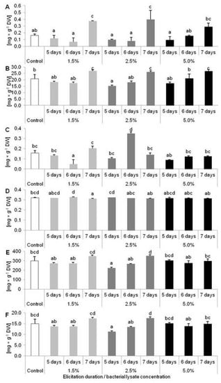 Accumulation of phenolic derivatives in Dionaea muscipula plants after five, six and seven days of elicitation with Cronobacter sakazakii lysate in different concentrations: (A) caffeic acid; (B) myricetin; (C) ellagic acid; (D) hyperoside; (E) salicylic acid; and (F) quercetin; different letters—significant difference between means at p < 0.05, bar—standard deviation.