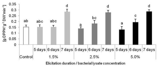 ROS scavenging activity (expressed as g DPPH reduced per g DW per minute) of Dionaea muscipula plants after 5, 6 and 7 days of elicitation with Cronobacter sakazaki lysate in different concentrations; different letters—significant difference between means at p < 0.05, bar—standard deviation.