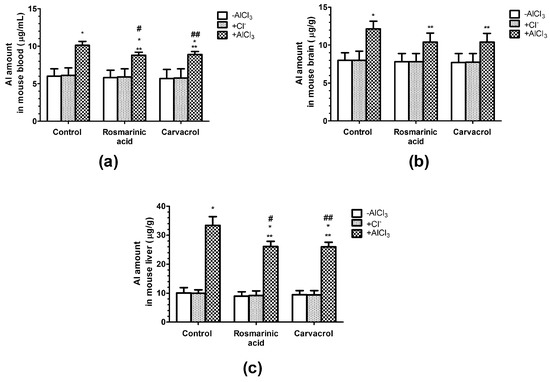 The amount of Al in mice blood was significantly increased by 69% compared to the vehicle control (6 µg/mL) in the case of AlCl3, whereas the administration of rosmarinic acid or carvacrol in the presence of AlCl3 decreased its effect by 30% (Figure 1a).