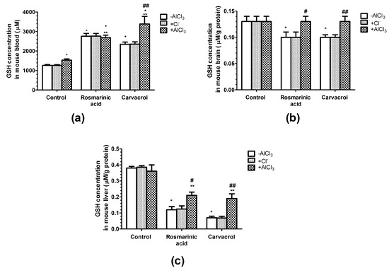 Influence of aluminum ions, rosmarinc acid, and carvacrol on the concentration of glutathione (GSH) in mice erythrocytes (a) and brain (b) or liver (c) homogenates. (n = 9, * p < 0.001 vs. control, ** p < 0.001 vs. AlCl3, # p < 0.01 vs. rosmarinic acid in the absence of AlCl3, ## p < 0.01 vs. carvacrol in the absence of AlCl3).