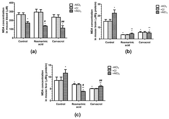 Influence of aluminum ions, rosmarinc acid, and carvacrol on the concentration of malondialdehyde (MDA) in mice erythrocytes (a) and brain (b) or liver (c) homogenates. (n = 9, * p < 0.001 vs. control, ** p < 0.001 vs. AlCl3, # p < 0.001 vs. rosmarinic acid in the absence of AlCl3, ## p < 0.001 vs. carvacrol in the absence of AlCl3).