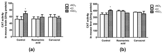 Influence of aluminum ions, rosmarinc acid, and carvacrol on the activity of catalase (CAT) in mice brain (a) and liver (b) homogenates (n = 9, * p < 0.05 vs. control).