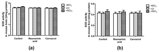 Influence of aluminum ions, rosmarinc acid, and carvacrol on the activity of superoxide dismutase (SOD) in mice brain (a) and liver (b) homogenates (n = 9).