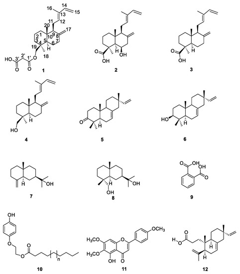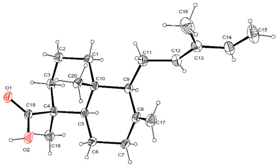 Trans-communic acid (3): colorless crystals; m.p. 118–120 (reported 135–137 °C); [α]D589 = +45.3 (c 0.40, CHCl3) (reported + 47.7; c 0.45, CHCl3); NMR data were essentially the same as reported [29].