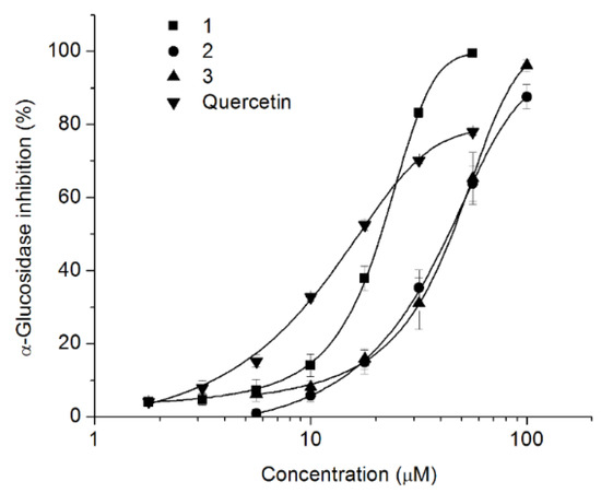 Concentration-response evaluation of compounds 1–3 isolated from S. cinnabarina on yeast α-glucosidase inhibition. Each value represents the mean of three independent experiments ± SEM; The data were analyzed by ANOVA followed by Dunnet post hoc test for comparison with control group.
