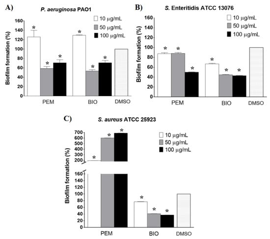 Both plant extracts inhibited biofilm formation in P. aeruginosa PAO1 at concentrations of 50 µg/mL and 100 µg/mL (Figure 1A), but the effects were not dose-dependent. The PEM extract inhibited biofilm formation in S. Enteritidis by up to 50% at 100 µg/mL, while the BIO extract reduced biofilm formation by 60% at a concentration of 50 µg/mL (Figure 1B). The PEM and BIO extracts showed similar antibiofilm effects against Gram-negative bacterial species, but in S. aureus, in the presence of PEM, biofilm formation was stimulated in a dose-dependent manner, while BIO had the opposite effect—it prevented biofilm formation by up to 60% with an increased concentration (Figure 1C).