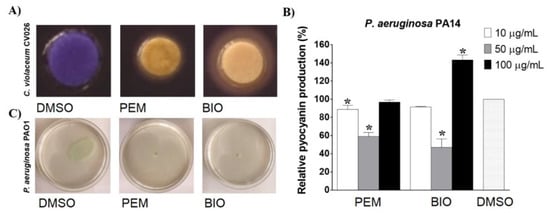 Figure 2. Anti-quorum sensing activity of the PEM and BIO extracts. Effect of the extracts on (A) violacein production detected in C. violaceum CV026 disk assay (250 μg/disk), (B) pyocyanin synthesis in P. aeruginosa PA14 and (C) swarming motility in P. aeruginosa PAO1 (50 µg/mL).
