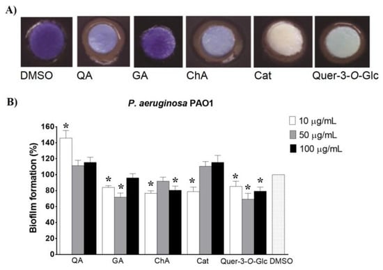 Prior to analysing the interference of the extracts and selected constituents with QS signalling pathways, we quantified the anti-QS and antibiofilm activity of five of the extracts’ components—QA, GA, ChA, Cat and Quer-3-O-Glc (Table 1). The inhibition of violacein production in C. violaceum CV026 with pure compounds was observed for all except GA (Figure 3A). When their effects on P. aeruginosa PAO1 biofilm development were tested, both stimulating and reducing activities were observed (Figure 3B). The strongest antibiofilm activities were evidenced for Quer-3-O-Glc (31%) and GA (28%), both at 50 µg/mL concentration, while QA exhibited only a stimulatory effect on biofilm formation regardless of the concentration. The obtained results were in accordance with published data [21,22,23,24].