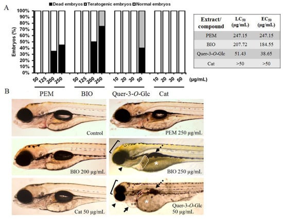 Figure 4. Toxicity assessment of PEM, BIO, Cat and Quer-3-O-Glc LC50 values (μg/mL). (A) Morphology of zebrafish embryos after different treatments and (B) Teratogenic malformations induced with BIO (250 µg/mL) and Quer-3-O-Glc (50 µg/mL): malformed head and eyes (bracket), malformed jaw (arrowhead), pericardial oedema (arrow), no inflated swim bladder (dashed arrow) and the signs of hepatotoxicity, such as dark yolk (asterisk) and dark liver (dashed area).