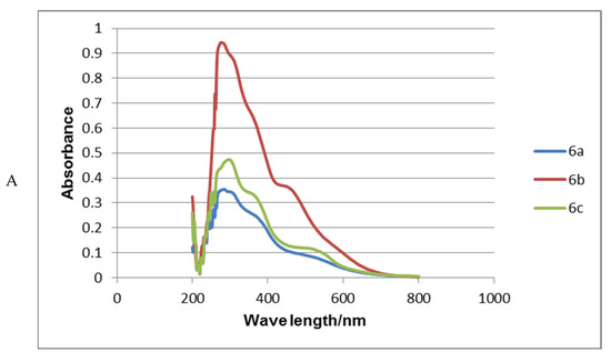 The UV-Vis absorption spectra (A) of the synthesized dyes (6a–c) are measured in DMF (Figure 1), where the values of maximum absorbance wavelengths (λmax) are affected by the strength of the donor in direct proportion. Dye (6b) has a carbonyl group with a stronger accepting character than that of carboxylate and cyano chromophores of (6a) and (6c), respectively; thus, it shows the highest λmax. Since the absorption of D-π-A could be shifted towards longer (λ) (i.e., intramolecular donor and acceptor charge transfer), these dyes may be applied for solar cells [24]. Concurrently, the energy levels could be adjusted by incorporating different anchoring nuclei and the π bridge.