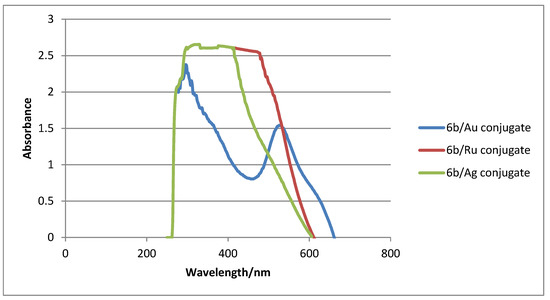 The adsorbed dye/Au, Ru and/or Ag nanoparticle conjugates (6b/NPs) on nanoporous TiO2 exhibit the role of their plasmonic resonance phenomena in the enhancement of adsorption efficiency (Figure 3). Generally, the conjugation with nanoparticles shows a slightly higher adsorption amount on the TiO2 nanocrystalline surface, in the order Ag > Ru > Au, than in the case of dye only.