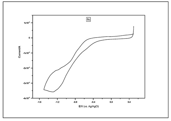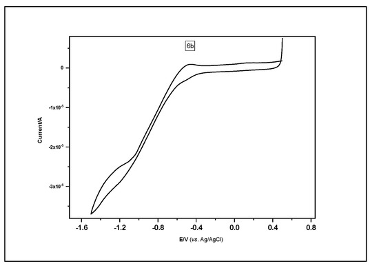 Figure 4, Figure 5 and Figure 6 show CVs for dyes (6a‒c) in dichloromethane (DCM) with 100 mM tetrabutyl ammonium perchlorate (TBAP) as supporting electrolyte, where a single reversible oxidative wave in a positive potential and an irreversible reductive one in a negative potential appear.