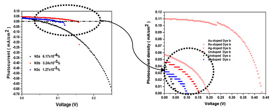 Furthermore, conjugation of the dye molecules with metal nanoparticles exhibits a remarkable change in photovoltaic performance, as described by Table 3 and Figure 7. It’s obviously clear that conjugation of dye (6b) with silver nanoparticles enhances the efficiency (η = 2.82 × 10−2%) compared with conjugates with Ru and Au in descending order (6b/RuNPs; η = 4.16 × 10−3% and 6b/AuNPs; η = 2.79 × 10−3%), which could be explained by its higher adsorption on nanoporous TiO2 (Figure 3).