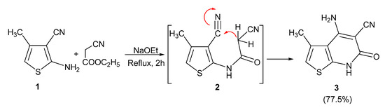 The mechanism of this reaction was proposed by Gewald [27]. The structure of the prepared starting compound (1) is secured by its micro and spectroscopic analyses and found to be in good agreement with the literature [28]. The cyclization of 2-amino-3-cyano-4-methylthiophene (1) with ethyl-cyanoacetate in the presence of sodium ethoxide affords the 4-amino-6,7-dihydro-3-methyl-6-oxothieno[2,3-b]pyridine-5-carbonitrile (3), as depicted in Scheme 2 [29].